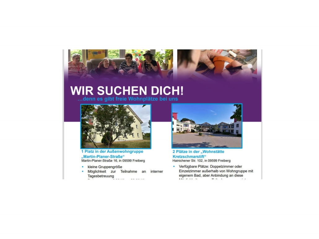 Es ist ein Platz im Doppelzimmer in der Wohnstätte Kretzschmarstift (Hainichener Straße, Freiberg) und ein Einzelzimmer mit eigenem Bad außerhalb einer Wohngruppe, aber mit Anbindung an diese, zu vergeben.