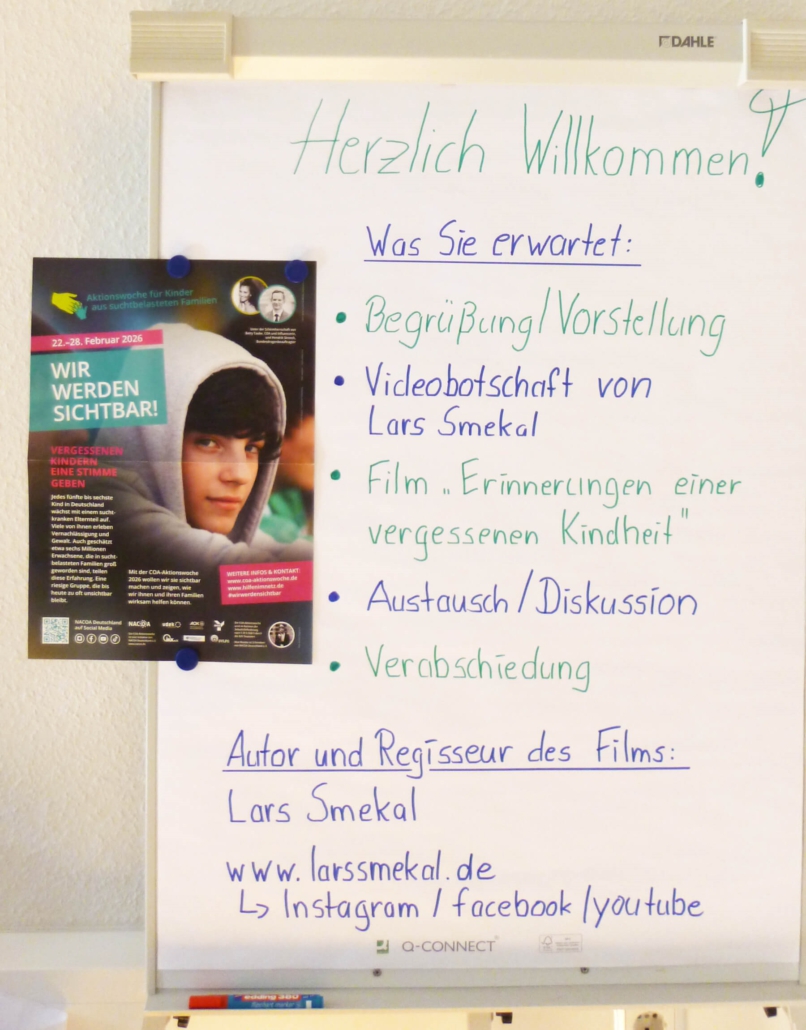 Gezeigt wurde der preisgekrönte Film „Erinnerungen einer vergessenen Kindheit“ von Lars Smekal, welcher die Lebenswelt von Niklas (11 Jahre) in seiner von Sucht belasteten Familie eindrücklich verdeutlicht. Ein Film, der unter die Haut ging.